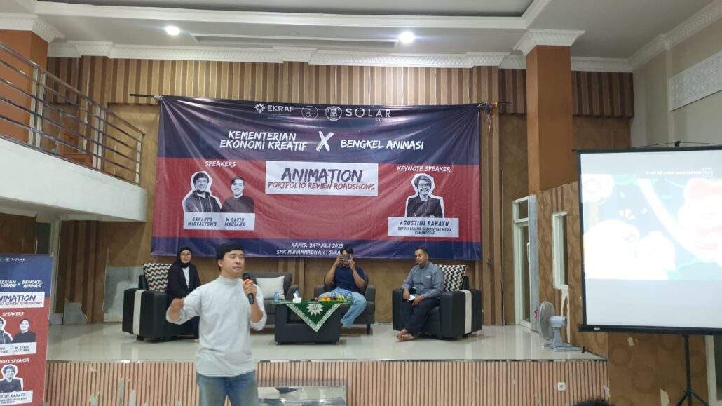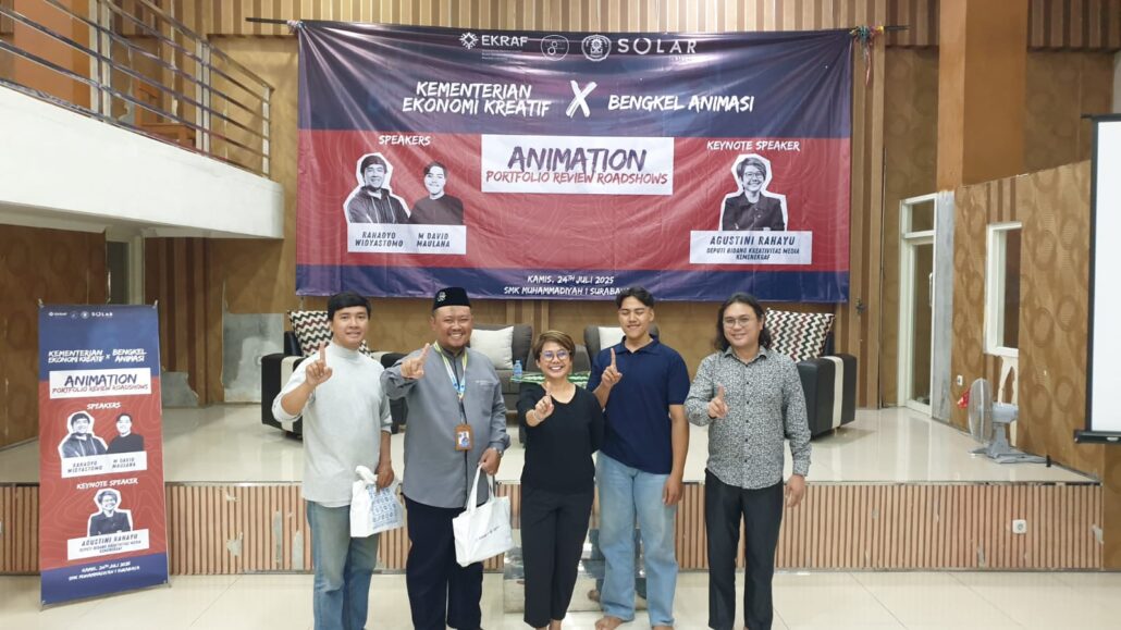 Surabaya –Ratusan peserta didik SMK Muhammadiyah 1 Surabaya dari kelas XI-XII Konsentrasi Keahlian Desain Komunikasi Visual (DKV) antusias mengikuti Roadshow yang diselenggarakan oleh Kementerian Ekonomi Kreatif (Kemenparekraf) yang berkolaborasi dengan Bengkel Animasi. Acara yang bertajuk “Animation Portfolio Review Roadshows” dilaksanakan di Aula SMK Muhammadiyah 1 Surabaya pada hari Kamis, 24 Juli 2025 sejak pukul 13.00 WIB hingga selesai. Dengan adanya kegiatan ini memberikan kesempatan emas bagi para pegiat dan calon animator di Surabaya khususnya siswa-siswi SMK Mudisa untuk mendapatkan wawasan serta umpan balik langsung dari para ahli.