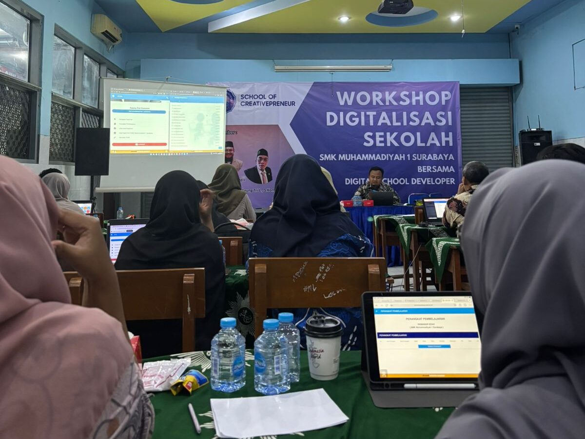 Surabaya — SMK Muhammadiyah 1 Surabaya meningkatkan komitmennya untuk terus beradaptasi dengan era digital melalui penyelenggaraan workshop selama 2 Hari, 23-24 Agustus 2025, yang bertajuk “Digitalisasi Sekolah Bersama Digital School Developer”. Workshop ini dihadiri oleh seluruh staf pengajar dan karyawan sekolah, bertujuan untuk mempersiapkan sumber daya manusia yang kompeten dalam mengelola ekosistem sekolah berbasis digital.