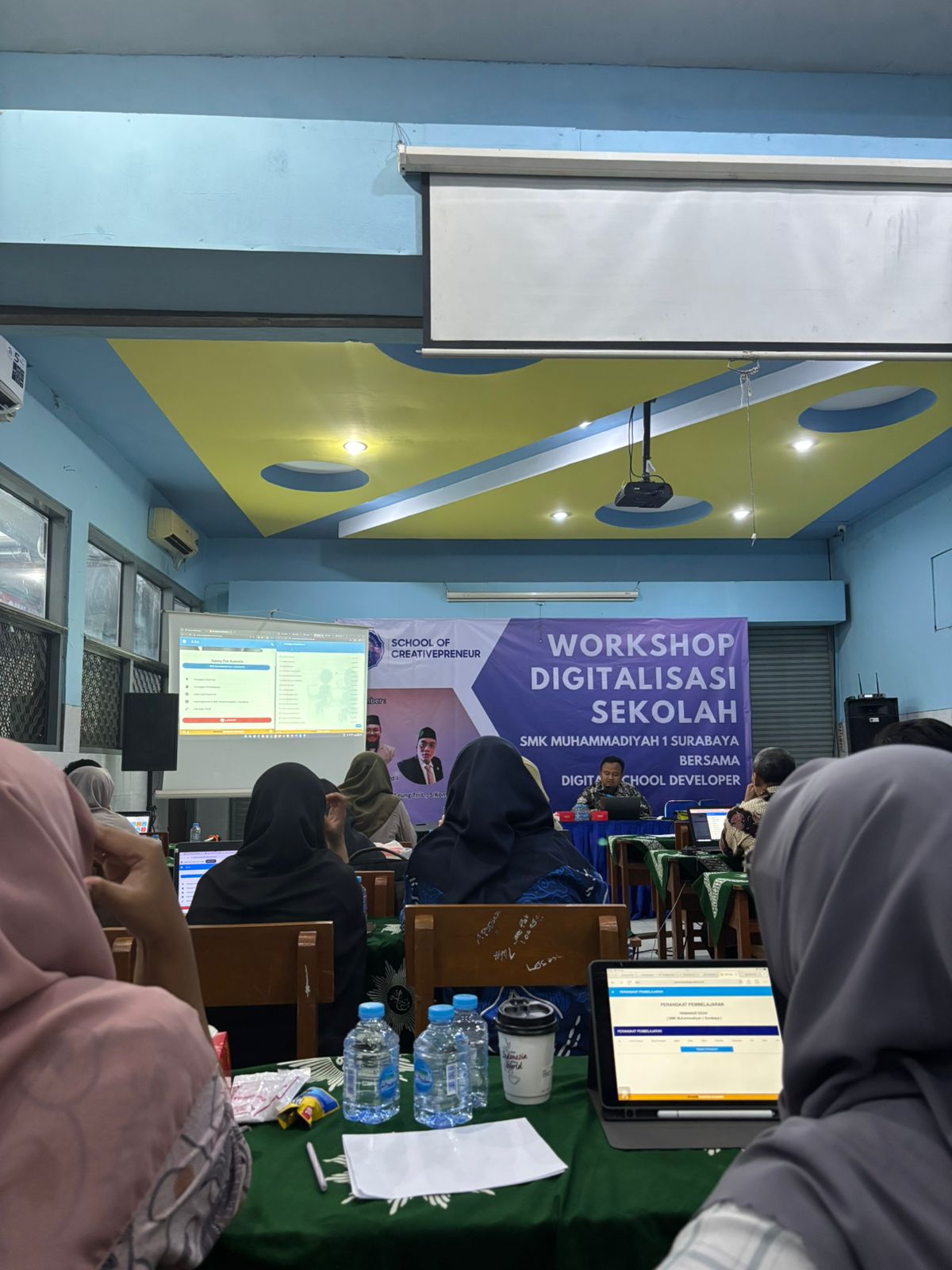 Surabaya — SMK Muhammadiyah 1 Surabaya meningkatkan komitmennya untuk terus beradaptasi dengan era digital melalui penyelenggaraan workshop selama 2 Hari, 23-24 Agustus 2025, yang bertajuk “Digitalisasi Sekolah Bersama Digital School Developer”. Workshop ini dihadiri oleh seluruh staf pengajar dan karyawan sekolah, bertujuan untuk mempersiapkan sumber daya manusia yang kompeten dalam mengelola ekosistem sekolah berbasis digital.