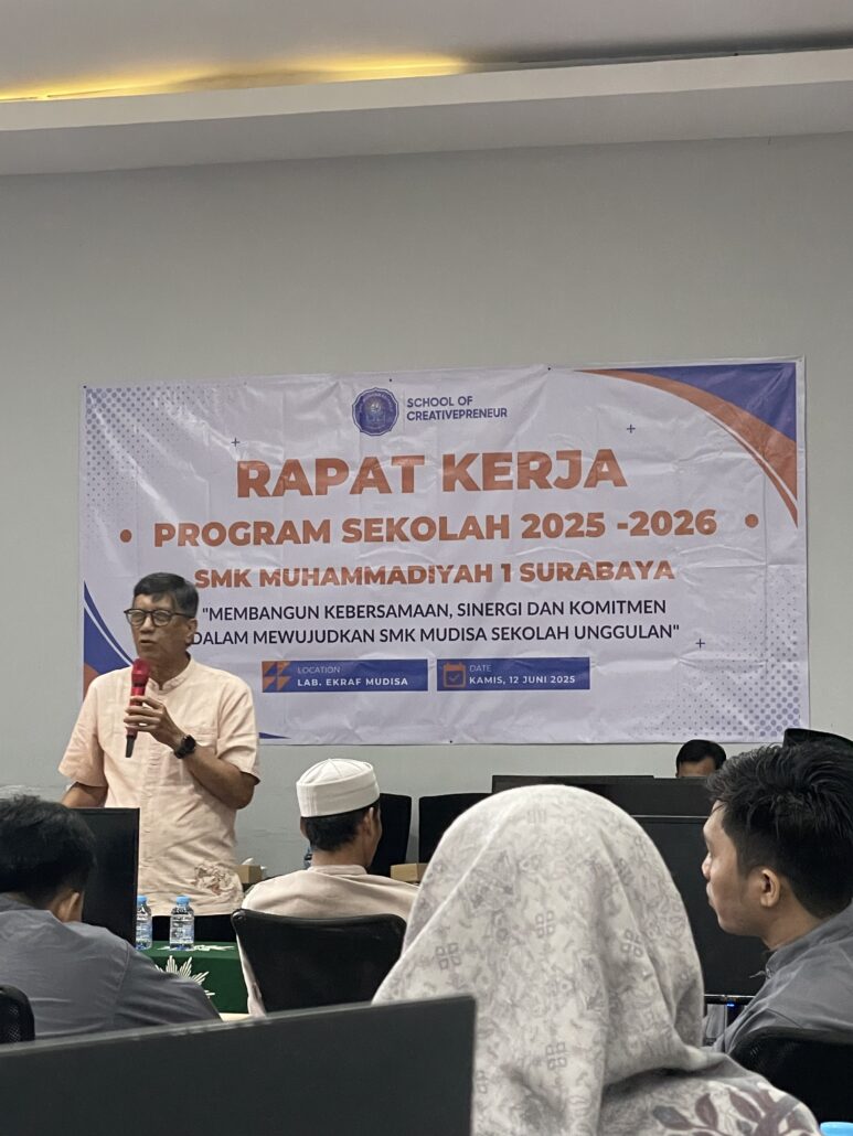 Surabaya – SMK Muhammadiyah 1 Surabaya menggelar Rapat Kerja Tahun Program Sekolah 2025-2026 pada Kamis (12/6/2025) di Lab. Ekraf SMK Mudisa. Raker yang dipimpin oleh Kepala SMK Mudisa ini bertema Membangun Kebersamaan, Sinergi dan Komitmen Dalam Mewujudkan SMK Mudisa Sekolah Unggulan. Kegiatan dimulai dengan sambutan-sambutan dari berbagai kalangan seperti perwakilan dari Majelis Dikdasmen PCM Simokerto, Asyari, M. Pd. Serta Ketua PCM Simokerto, Sudarusman, S. T.
